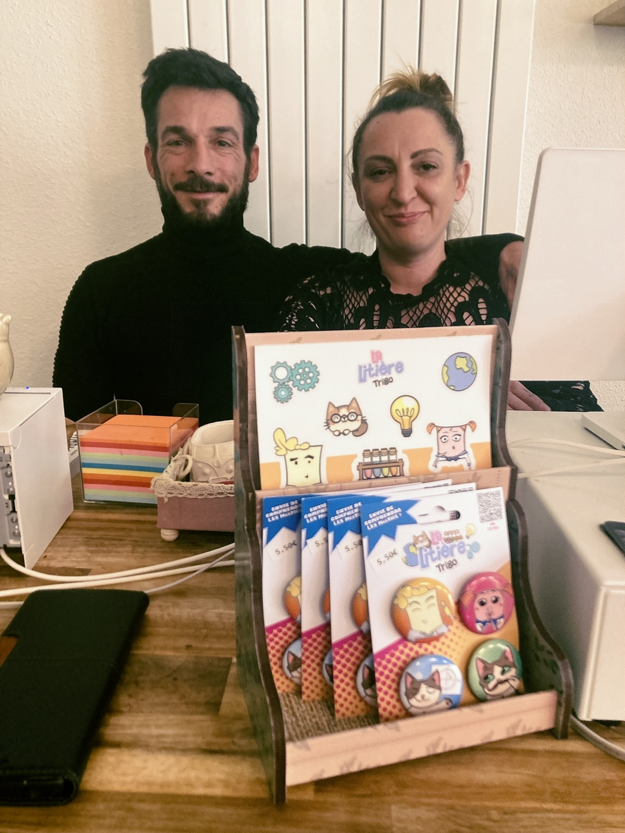 Ô Lounge Cats, bar à chats de Saint Chéron, est actuellement le seul endroit où vous trouverez les goodies "La Litière: trigo", stickers et badges.
